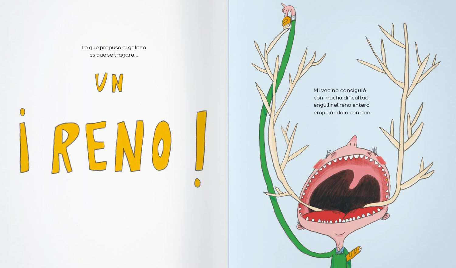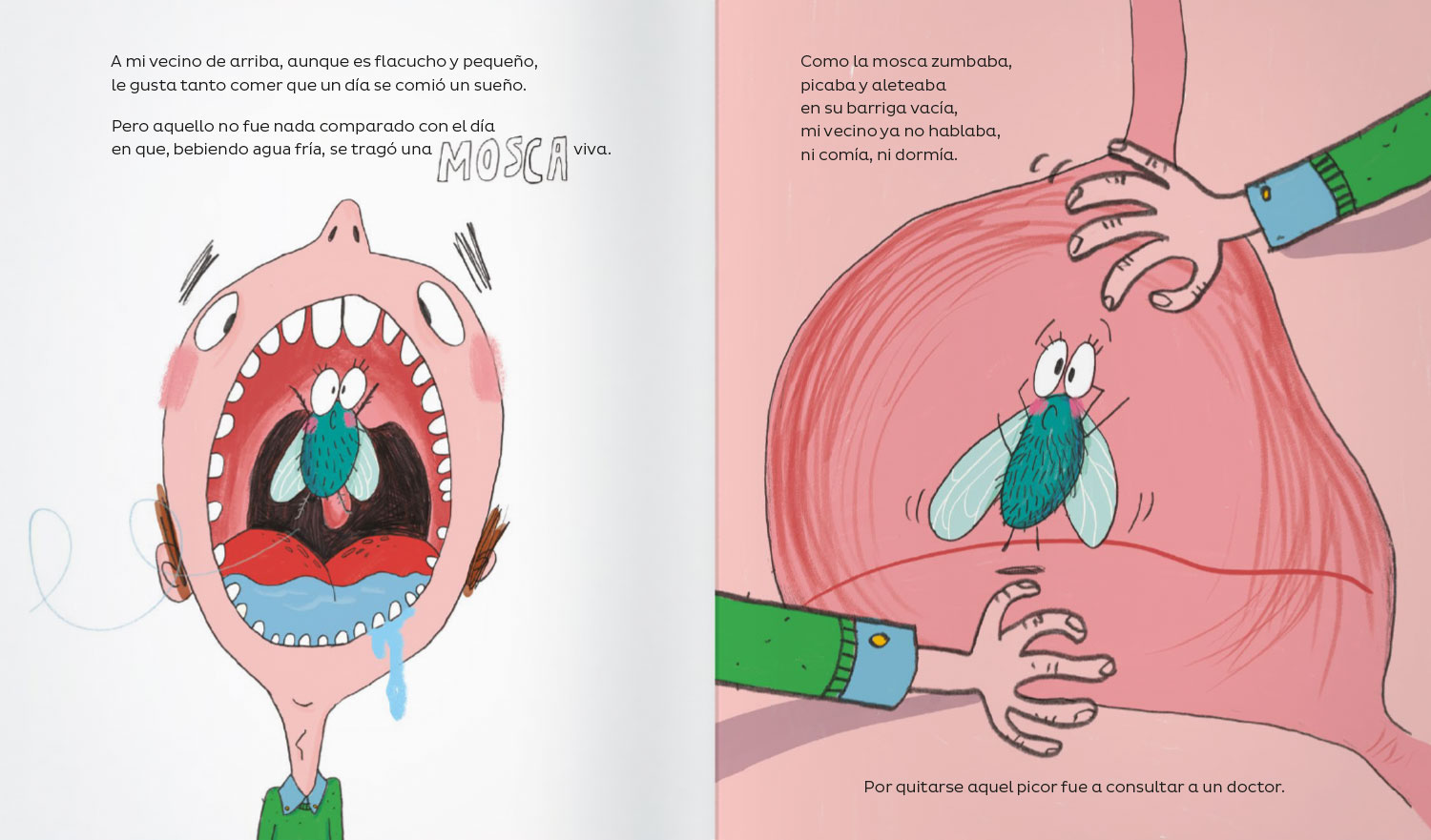 Gracia Iglesias nos cuenta lo que le ocurrió a su vecino, que se tragó por accidente una mosca. Como la mosca zumbaba en su estómago, decidió seguir el consejo del doctor y engullir una araña para atraparla. La araña no solo atrapó a la mosca sino que además tejió una telaraña que le hacía unas cosquillas insoportables. El remedio del doctor fue que tragase un pájaro, ¡seguro que podría resolver el problema!, y lo hizo, pero también construyó un nido dentro de él. Para acabar con los trinos, tragarse un gato fue la nueva recomendación. Y así, las soluciones se van encadenando de forma disparatada. ¿Conseguirá el vecino de Gracia resolver su problema?