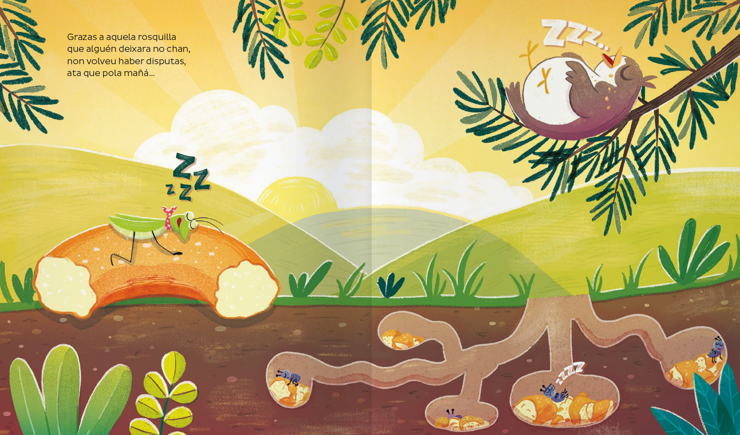 A aparición dunha rosquilla que alguén deixou tirada no parque é o comezo das aventuras e desventuras por apropriarse do botín dos tres protagonistas desta historia: un saltón, unha formiga e un pardal. Unha historia divertidísima de como apropiarse de algo e como chegar a unha solución colaborativa. Escrita en rima por Pablo Rumoroso e ilustrada por Sara Mateos.
